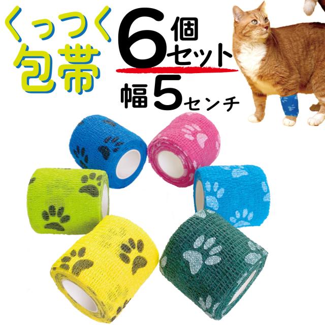 犬 包帯 猫 幅5cm くっつく 手で切れる テーピング バンデージ ペット 自着性弾力包帯テープ 6巻 不織布 伸縮性 通気性 怪我 傷舐め防止 保護 自着性伸縮包帯
