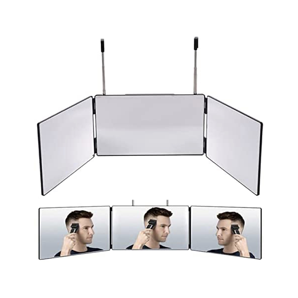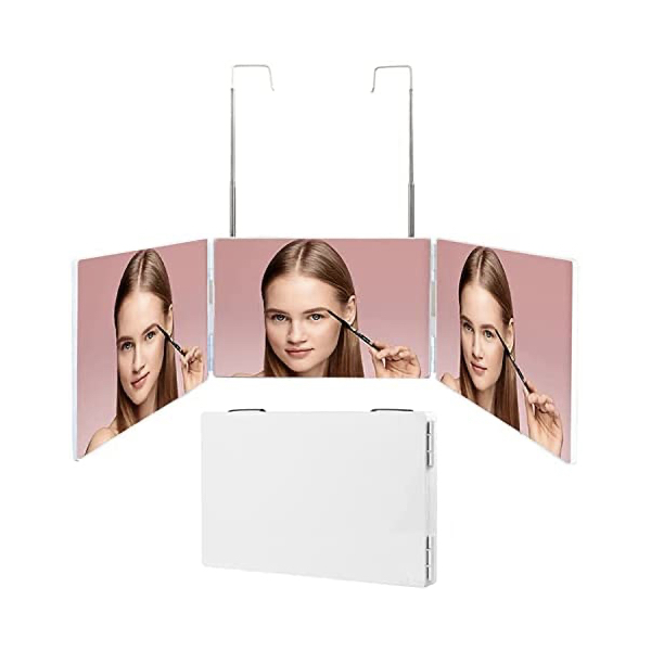 壁掛けタイプの三面鏡です。メイクアップや後頭部のセルフカットなどの際に役立ちます。
