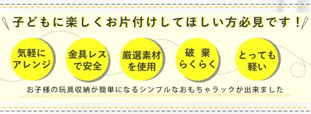■特徴■シンプルでお子様の片づけがはかどる斜め収納型玩具ラックです。傾斜があるので中身が見えやすく、お子様が探し物をして散らかることもありません。ダンボール製で軽くとても安全です。・組み立ても簡単です。(約10-15分)※個人差もありますが、1人で組み立てた時の作業時間です。