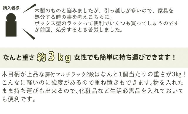 ■特徴■縦横自由に配置できるマルチに大活躍まちがいなしの木目柄扉付マルチラック2段の3ヶセットです。扉付きで目隠し収納することでお部屋をすっきり見せることが出来ます!収納可能!マルチラックと組み合わせるとより統一感が出ます。お部屋を統一して大収納が欲しいならまずこちら!