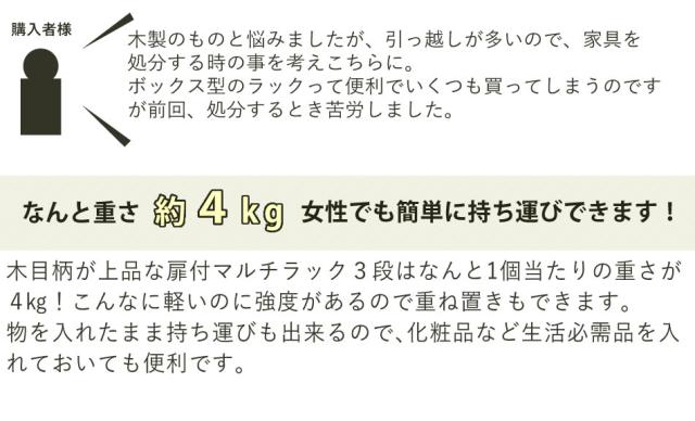 ■特徴■扉付きですっきり収納出来るシンプルな木目柄の3段マルチラックです。3段それぞれの高さが約27.5cmです。
