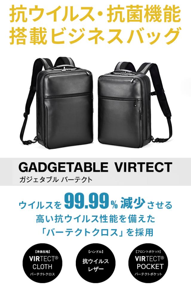 | ブランド |エース. ジーンレーベル / ace. GENE LABEL シリーズ |ガジェタブル バーテクト |GADGETABLE VIRTECT 品番 |67542 形状 |ビジネスリュック / 2気室 外寸 |W280×H390×D100[mm] 重量 |約 1,080g 収納サイズ |B4用紙 / 15inchノートPC 容量 |約 13L 素材 |主素材:合成皮革(抗ウイルス・抗菌加工) |副素材:牛革(抗ウイルス加工) 機能 |2気室 / B4用紙サイズ収納 / PC収納(15inch) |セットアップ可 / 2WAYスルーポケット? |スリムデザイン / 撥水 / 立体メッシュパッド |バーテクト?(抗菌・抗ウイルス)ポケット |