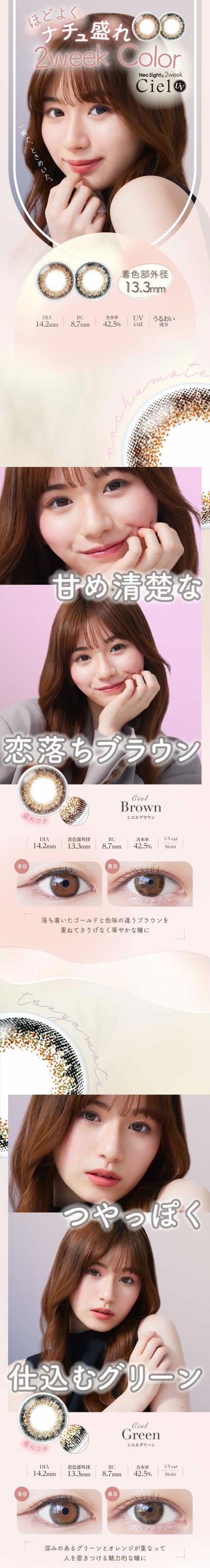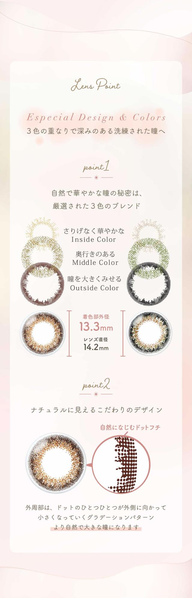 ■保存液にうるおい成分配合:うるおい成分「MPCポリマー」が潤いのヴェールとなり、乾燥感の軽減が期待できます。■UVカット:レンズに紫外線吸収剤を配合し、瞳に有害な紫外線(UV-Aを83%、UV-Bを98%)をカット■含水率42.5%・非イオン性:水分を適度に多く含む素材(含水率42.5%)を採用。なめらかなつけ心地に。タンパク質の汚れがつきにくく、快適な見え方を保ちます■ラップインテクノロジー:色素が直接眼に触れないデザイン