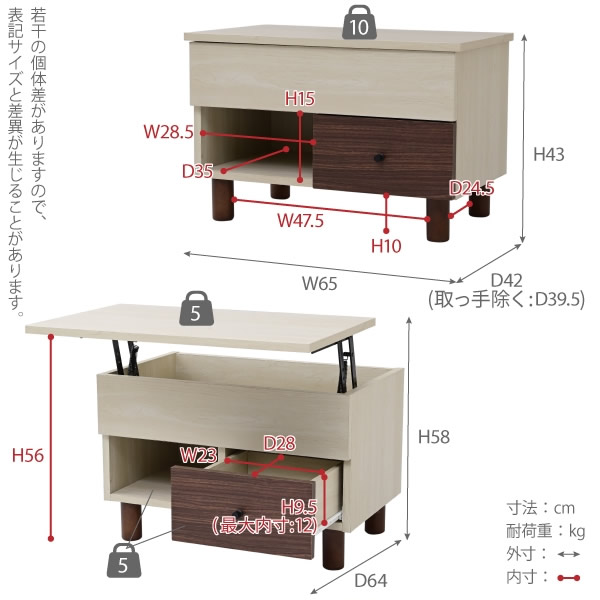 ※写真はメーカー様のカタログ等から掲載させて頂いております。 実物の商品と写真の色が若干写真写り等により異なる場合があります。 ■本体サイズ [外寸](リフト閉)幅65×奥行42(取っ手除く:39.5)×高さ43cm (リフト開)幅65×奥行64×高さ58cm ■その他サイズ [内寸] (天板内収納部)幅51(最大59)×奥行34.5cm×高さ12cm (引き出し)幅23×奥行28×高さ9.5(最大12)cm (オープン部)幅28.5×奥行35×高さ15cm (脚間)幅47.5×奥行24.5×高さ10cm ■材質 [本体]プリント紙化粧合板 ■耐荷重 [天板](リフト閉)約10kg以下(リフト開)約5kg以下 [天板下収納部]約5kg以下 [引き出し]約5kg以下 [オープン部]約5kg以下 ■脚、取っ手のみ組み立て ■脚裏フェルト付き ■生産国:中国 ■組立時間:大人2人(15分目安) お客様組立て品につきましては、組み立て後に不良の連絡をされても対応ができません。 組み立て前にパーツに不良・傷等がないか、必ずご確認下さいます様よろしくお願い申し上げます。