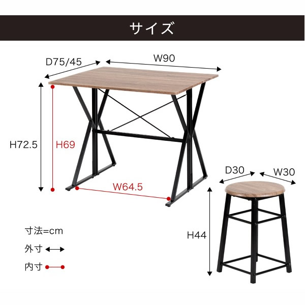■外寸:(テーブル)幅90×奥行45/75×高さ72.5cm(チェア)幅30×奥行30×高さ44cm