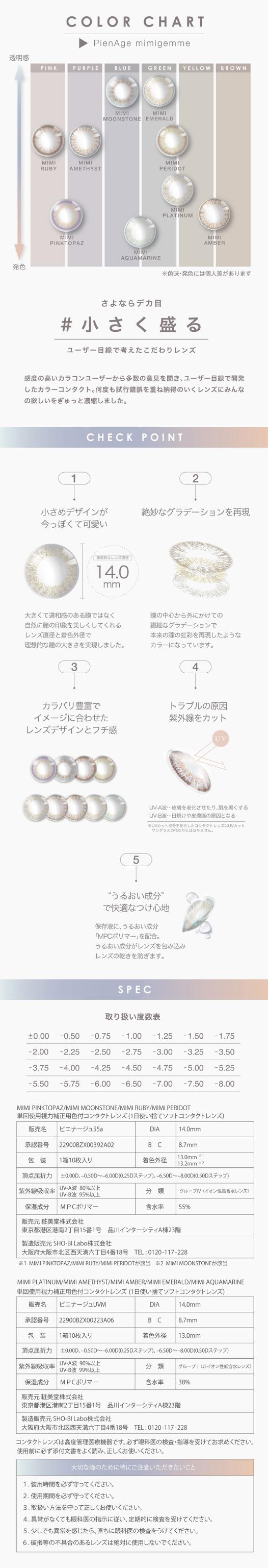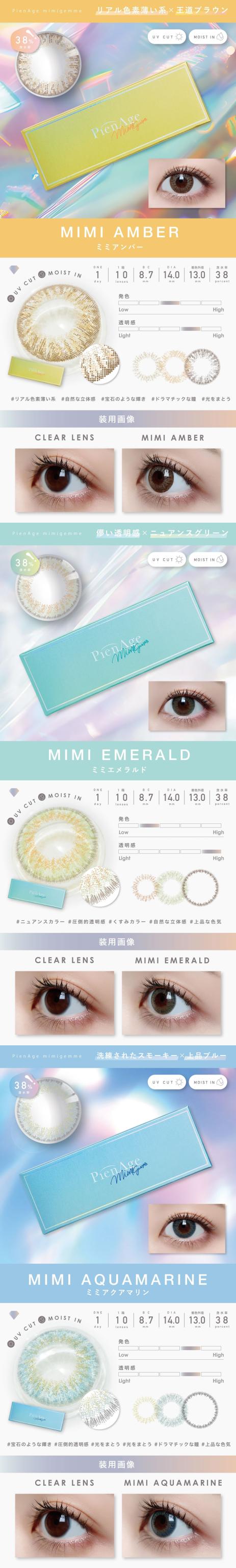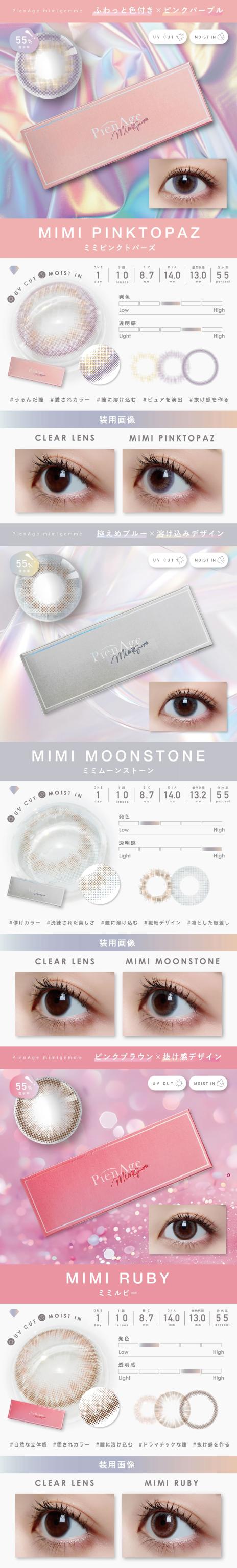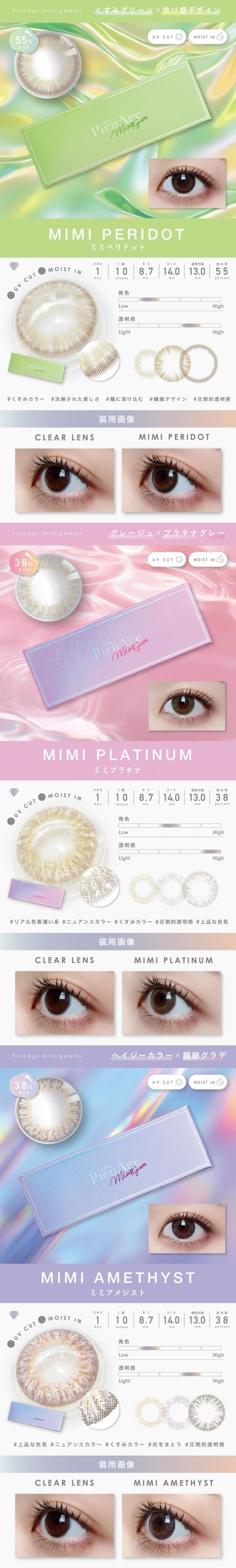 | カラー | ミミアメジスト【243】 ミミエメラルド【244】 ミミプラチナ【245】 ミミアクアマリン【246】 ミミアンバー【247】 ミミピンクトパーズ【329】 ミミムーンストーン【330】 ミミペリドット【770】 ミミルビー【771】 |