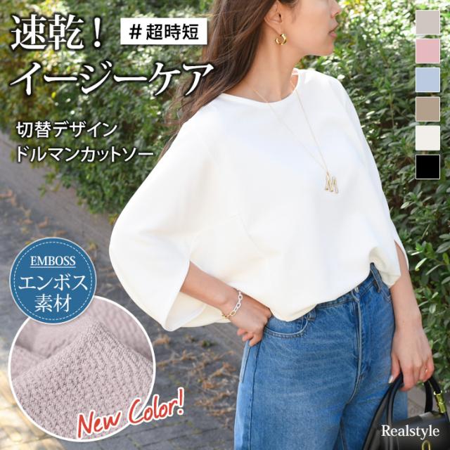 切替デザインドルマンエンボスカットソー レディース トップス きれいめ 春 夏 速乾 オフィス OL 仕事 ゆったり 大きめ イージーケア 5分袖 7分袖 半袖 Tシャツ 体型カバー 無地 大人 カジュアル コクーン プルオーバー 着痩せ 20代 30代 40代 50代 上品 楽ちん デイリー 着回し ラフ 在宅 リモート テレワーク おうち時間 通勤 リラックス 普段使い ラフ クラシカル 通学 シワになりにくい ストレッチ 伸縮性 動きやすい 疲れにくい 可愛い おしゃれ 軽量 軽い