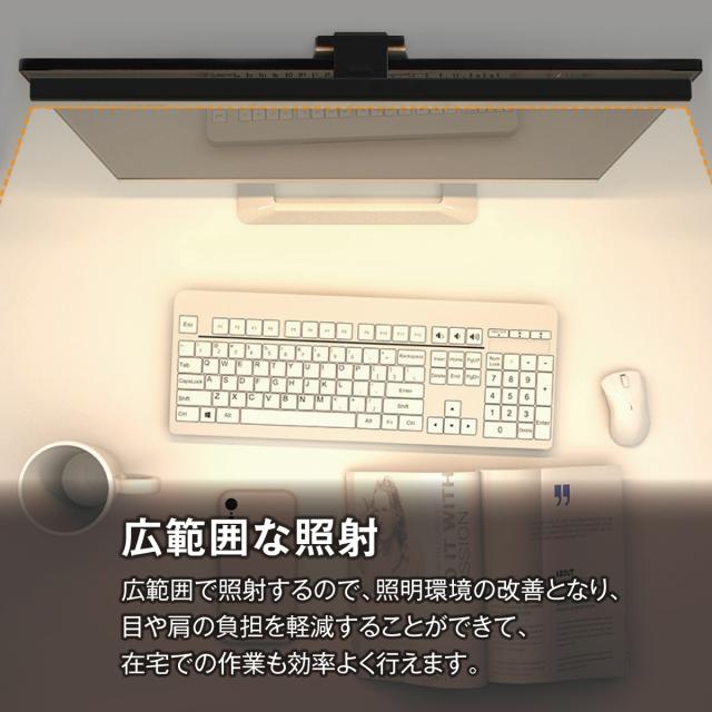 【邪魔しないモニターライト】モニターの上に設置するので、邪魔にならずスマートに設置できます。上から照らすので影ができることもなくストレスなく使用できます。