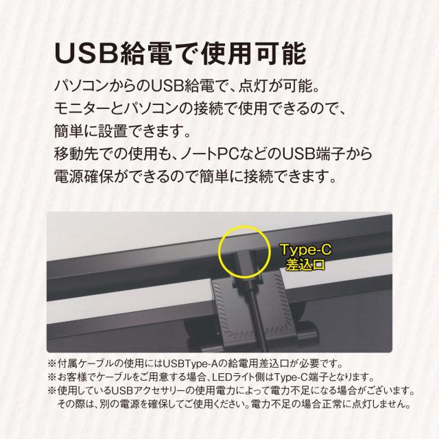【USB給電で使用可能】パソコンからのUSB給電で点灯が可能。モニターとパソコンの接続で使用できるので、簡単に設置できます。