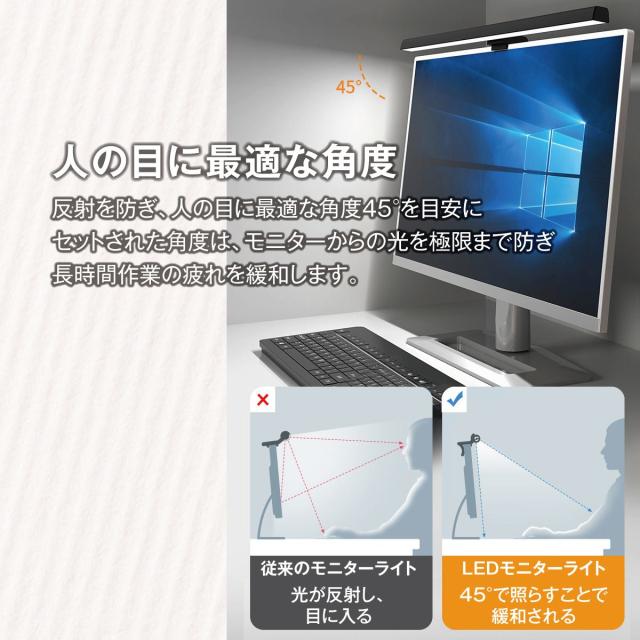 【人の目に最適な角度】反射を防ぎ、人の目に最適な角度45°を目安にセットされた角度は、モニターからの光を極限まで防ぎ、長時間作業の疲れを緩和します。