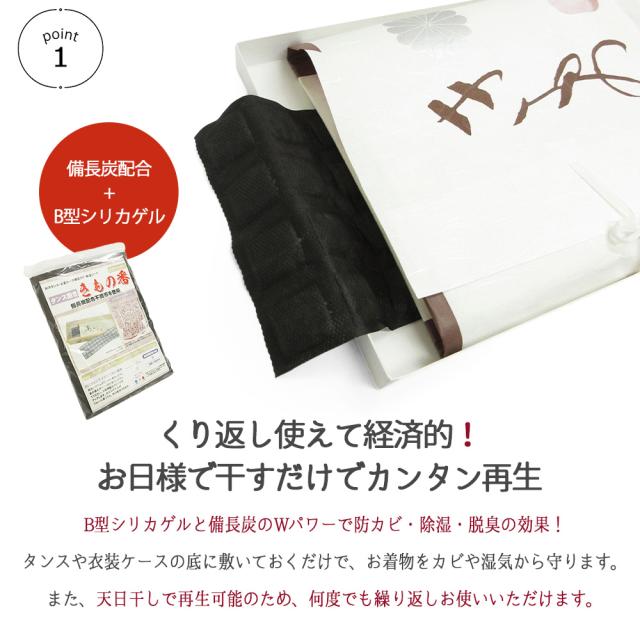 B型シリカゲルと備長炭使用の不織布のWパワーで、『坊カビ・除湿・脱臭』効果を持ち、大切なお着物をしっかり保管致します。