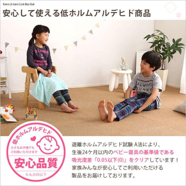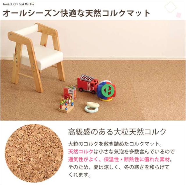 大粒の天然コルクを使用したジョイントコルクマット8枚タイプ。衝撃を吸収するEVA樹脂だから防音効果や保温効果があります!安心して使える低ホルムアルデヒド商品。水洗いできるから、汚れても安心♪レイアウトしやすいサイドパーツ付き。