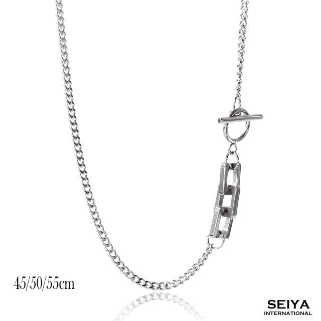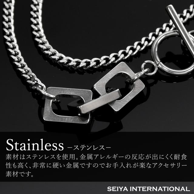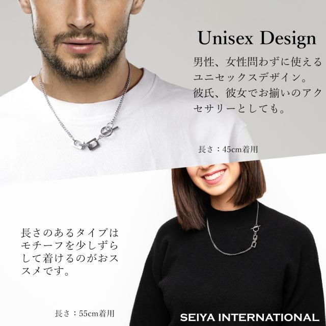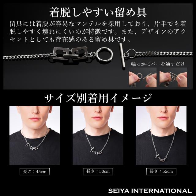 アクセントにもなるデザイン性の高さが人気のマンテル式金具を採用しました。マンテルネックレスの最大のメリットは、付け外しのしやすさにあります。輪っかの中に棒を通し、また外す時にはその棒を再び輪っかの中にくぐらせてから引き抜くというシンプルな動作で簡単に取付け、取外しができるアクセサリーです。デザイン性の高さと着けやすさを併せ持つ、マンテル式留め具を使用したチェーンネックレスはきれいめファッション、ストリート系ファッション、韓国ファッション等、様々なファッションジャンルから圧倒的人気を誇るネックレスです。