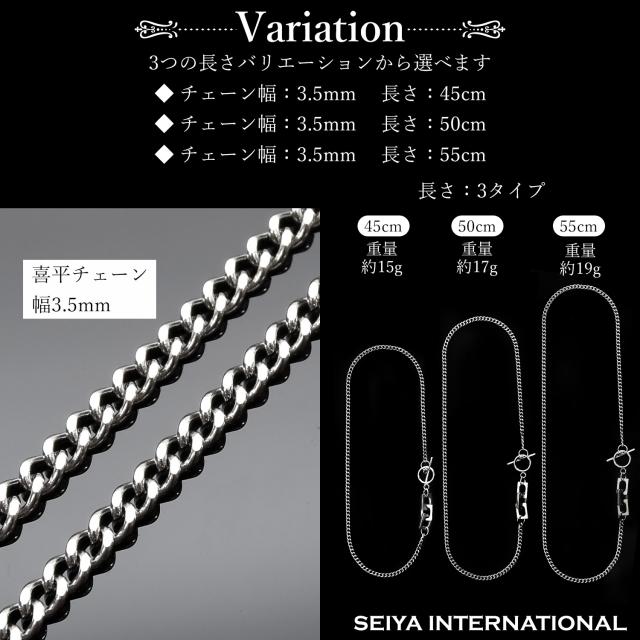 ネックレスチェーン幅3.5mm、チェーンの長さ45cm、50cm、55cmをご用意しております。シンプルな細めのチェーンタイプで長さを自由に選べるため、きっとあなたのお気に入りの商品が見つかるはずです。