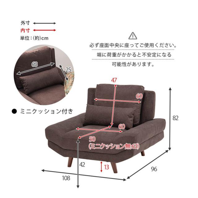 幅 108cm × 奥行 96cm × 高さ 71cm / 82cm × 座面高 31cm / 42cm座面奥行:50cm ※ミニクッション無し63cm