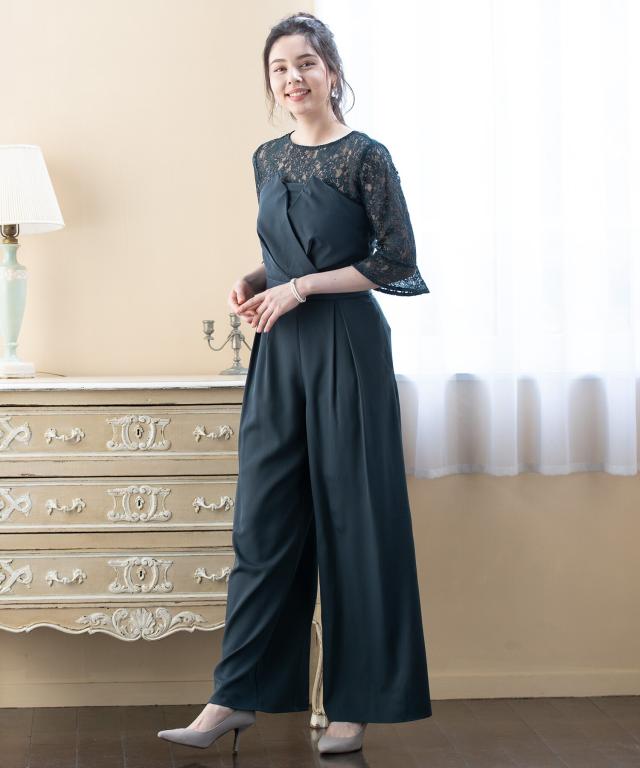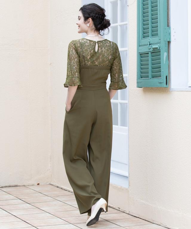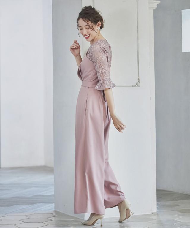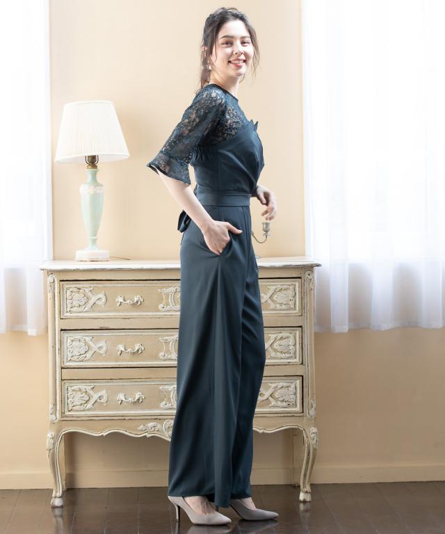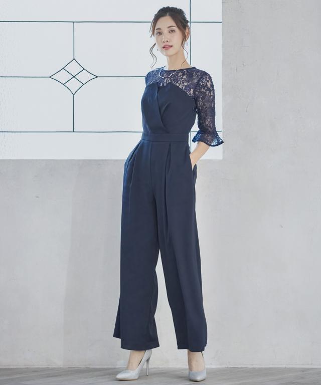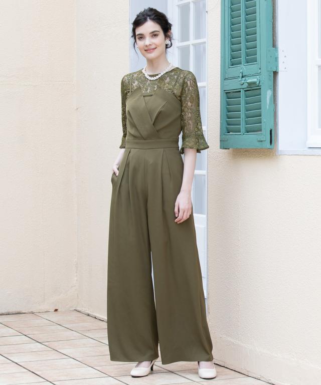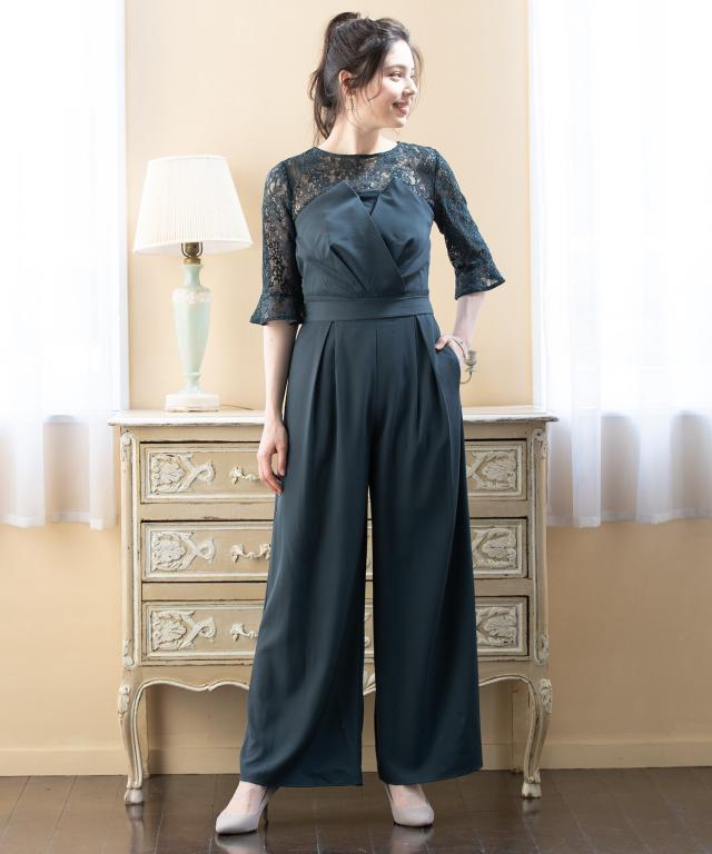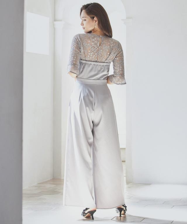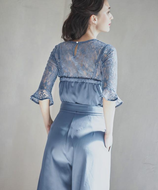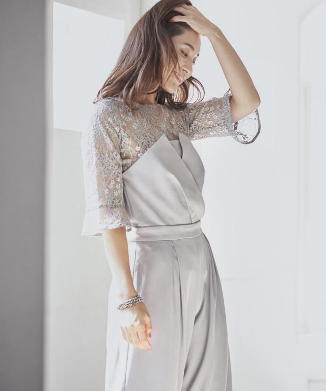 単品使いも可能な5分袖レースブラウスとワイドシルエットのベアトップジャンプスーツのセットアップ。