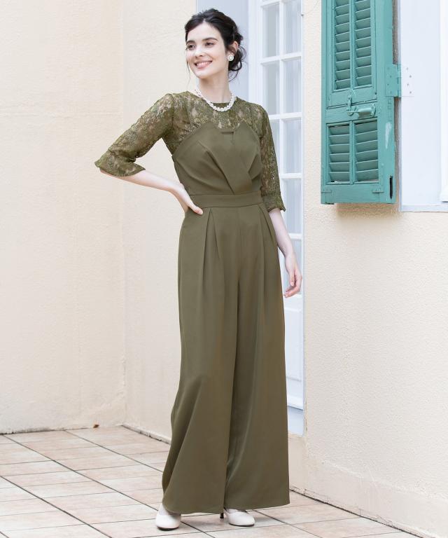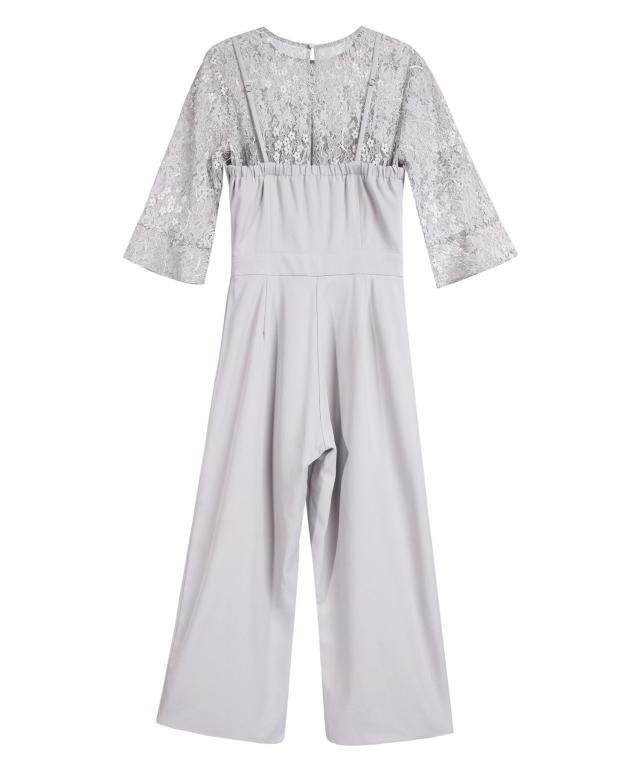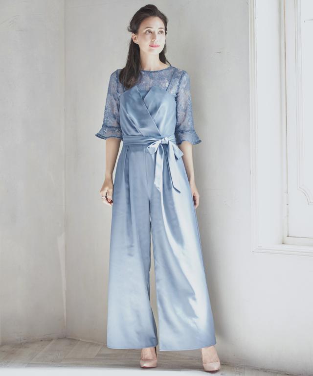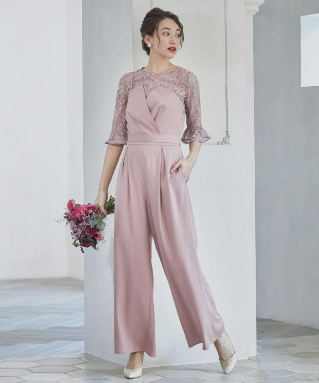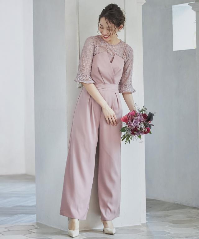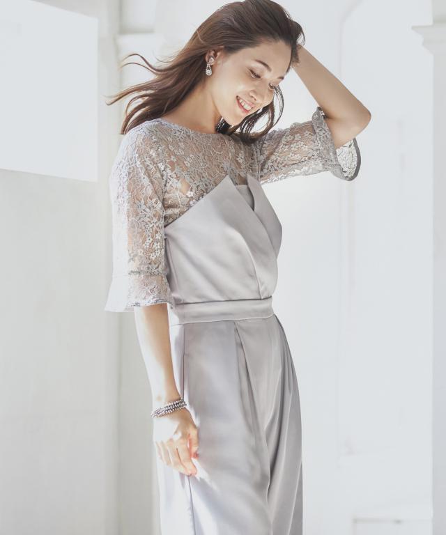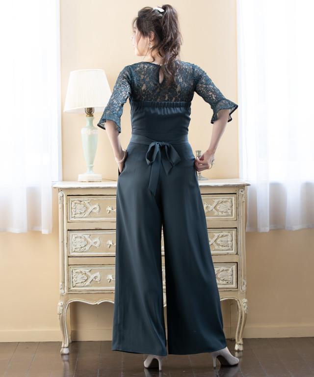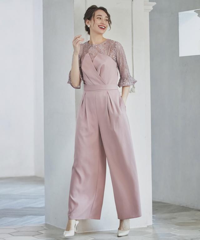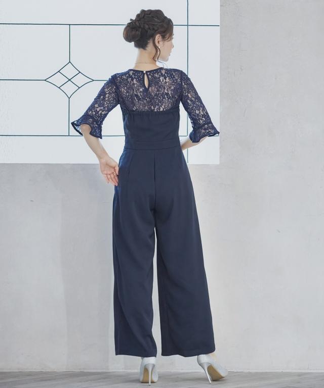 単品使いも可能な5分袖レースブラウスとワイドシルエットのベアトップジャンプスーツのセットアップ。
