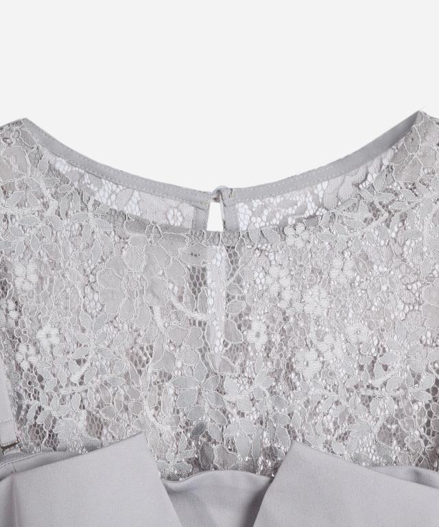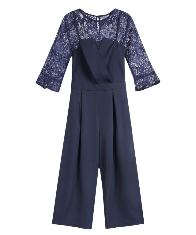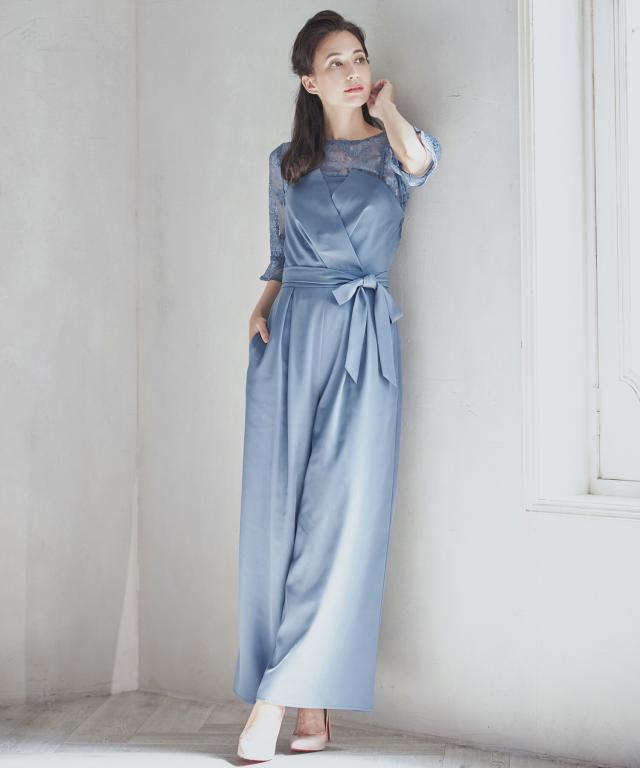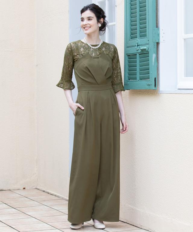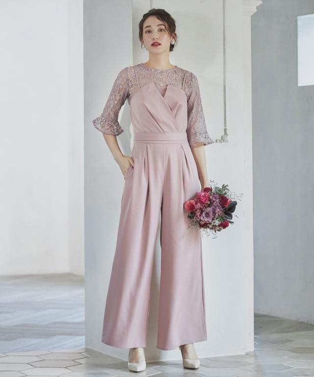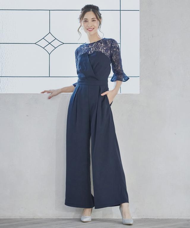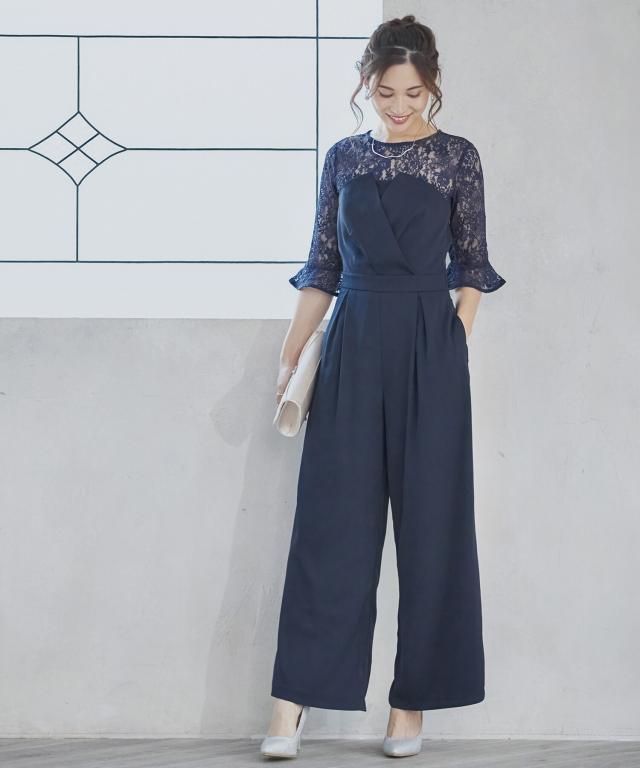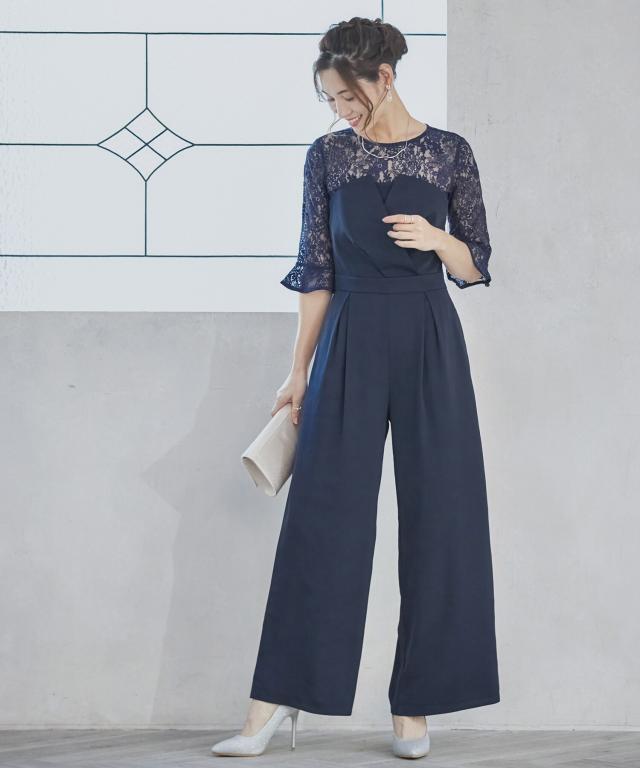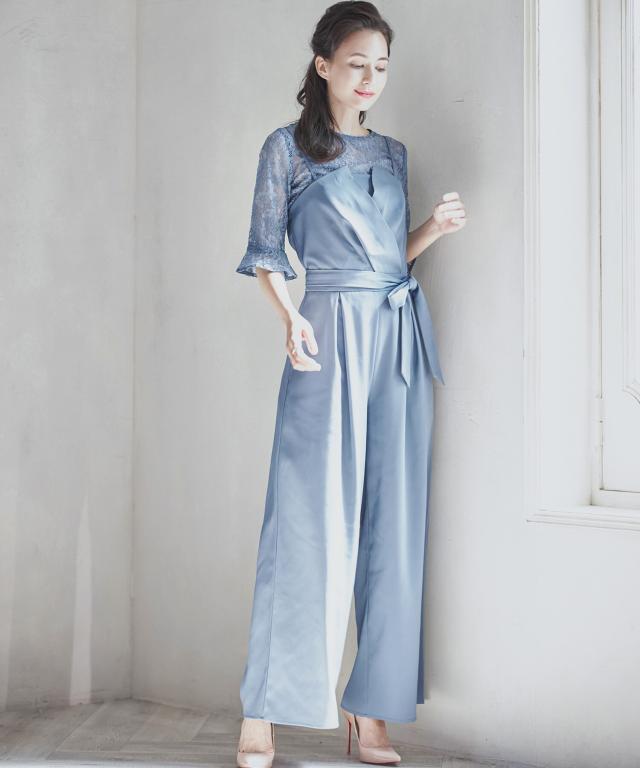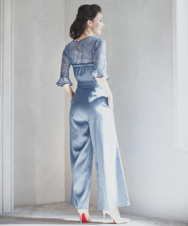 単品使いも可能な5分袖レースブラウスとワイドシルエットのベアトップジャンプスーツのセットアップ。