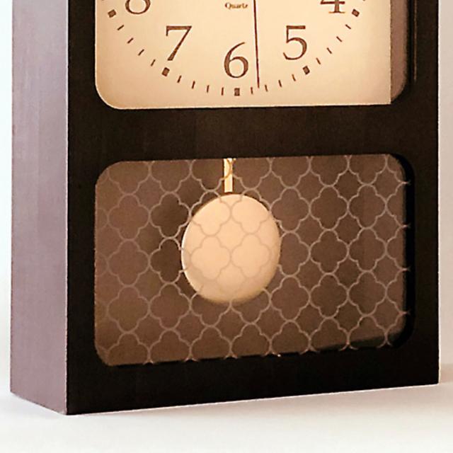 レトロな模様の入ったガラス越しに見える振り子が、懐かしい雰囲気を感じさせます。ガラスカバー付きでホコリがたまりにくく、サッと拭き取るだけでお手入れも簡単です。
