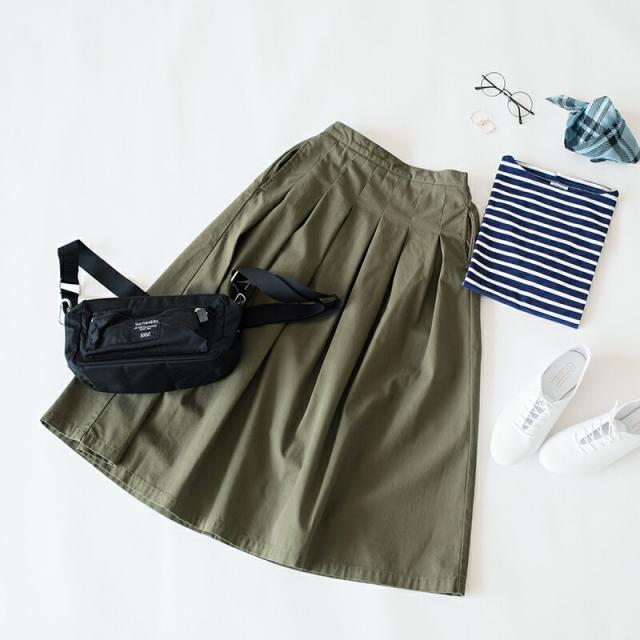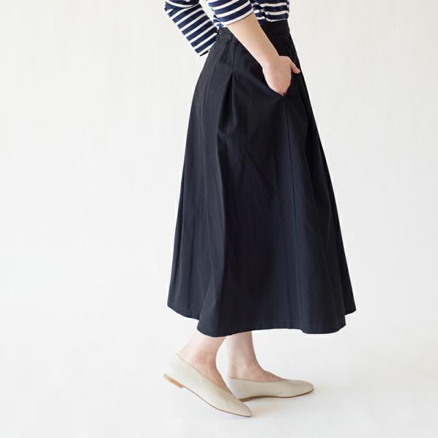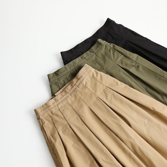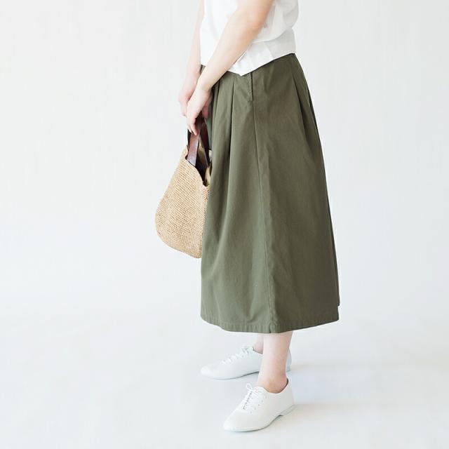 〘 ポイント1 〙今の気分のロング丈。![]() 着用カラー : ベージュ 0サイズ (モデル163cm) ブランド定番のスカートより丈感は長めに設定。 長すぎることはないので、フラットシューズでもヒールのあるブーツ等でもバランスよく着ていただけます。 ![]() 着用カラー : ベージュ 0サイズ (モデル163cm) ![]() 着用カラー : ネイビー 0サイズ (モデル163cm) サイドにはポケットもついています。 ![]() 着用カラー : カーキ 0サイズ (モデル163cm) 〘 ポイント2 〙タック位置を変え、広がりすぎないシルエットに。![]() 着用カラー : カーキ 0サイズ (モデル163cm) タック位置を下に下げることで、腰回りもすっきり、広がりすぎないシルエットに。 程よいボリューム感でシンプルなトップスでもおしゃれ見えが叶います。 ![]() 着用カラー : カーキ 0サイズ (モデル163cm) 〘 ポイント3 〙ウエストはサイド部分をゴム仕様に。![]() 着用カラー : ネイビー 0サイズ (モデル163cm) より幅広い体型の方に手にとってもらえるよう、ウエストのサイド部分のみゴム仕様に。 トップスインしても苦しくなく、サイドのみゴムなのでカジュアルすぎません。 ![]() 着用カラー : ネイビー 0サイズ (モデル163cm) 〘 ポイント4 〙環境にやさしいオーガニックコットン生地。![]() 生地はオーガニックコットンをチョイス。サンテラボらしく環境にも配慮しました。 生地感も定番品よりゴワつかない、さらりとやわらかな風合いに。 オーガニックコットンのツイル生地にシリコンを染み込ませる特殊加工を施すことで、シャリ感を残しつつ、綿素材には出しにくい合繊の様なタッチ、きれいめな生地感に仕上がっています。 またおうちでのお洗濯もOKなので、お手入れも楽ちんです。 オーガニックコットンって? 通常のコットン栽培ではかなりたくさんの化学肥料と農薬が使われています。土地だけでなく、栽培に携わる人々の身体にも負担が大きく、社会的な問題となっています。 ![]() | ||||||||||||||||||