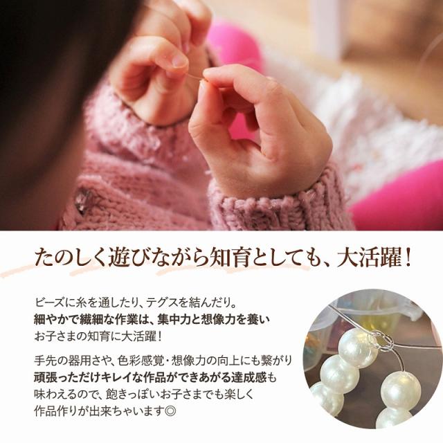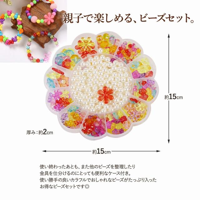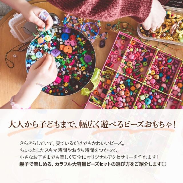 | 商品の説明 | かわいい洗練されたビーズをセットにしているので、デザインや絵が苦手な子でも、組み合わせるだけで統一されたデザインのアクセサリーが簡単に作れちゃいます。 集中力や根気、色彩能力を育てる知育にも◎ きらきらしていて、見ているだけでもかわいいビーズ。 ちょっとしたスキマ時間やおうち時間をつかって、小さなお子さまでも楽しく安全にオリジナルアクセサリーを作れます! 親子で楽しめる、カラフル大容量ビーズセットの選び方をご紹介します◎ 製造時期によって、ビーズの種類や付属品内容は若干変わる可能性がございます。 パーツはものによっては小さな傷やムラ、バリ・欠け・歪みロットによる個体差がある場合があります。予めご了承くださいませ。 他の子と被らないかわいいビーズカチューシャだって簡単に作れちゃいます。 ワイヤーカチューシャにビーズを通して、お気に入りのデザインにレイアウト。 先端の芯部分はむき出しだと痛いので、付属のカバー部分を着けたりりぼんを巻いたりするだけで簡単に完成◎ ビーズをきちんと「食べ物ではない」と判断して安易に口に入れたりしない年齢になってきたら、すこし小さめのパーツでも大丈夫。 自分の好きなものと色を組み合わせて、無限の想像力を満たせる複雑なパーツでもものづくりを楽しめます! まだ小さいお子さまでも、自分なりの好き嫌いは少しずつ芽生えてくる時期。 手先で触って飽きないような、カラフルで大きめ色んなバリエーションのビーズがおすすめです。 ビーズに糸を通したり、テグスを結んだり。 細やかで繊細な作業は、集中力と想像力を養いお子さまの知育に大活躍! 手先の器用さや、色彩感覚・想像力の向上にも繋がり頑張っただけキレイな作品ができあがる達成感も 味わえるので、飽きっぽいお子さまでも楽しく作品作りが出来ちゃいます◎ 親子で一緒に作品を作ったり、お揃いのアクセサリーお友達とつけたり。 たくさんあるビーズセットなら、作りながらいろいろなビーズを選べるので「ビーズが足りない!」なんてことにならず 型にはまらない自由な作品作りを楽しめます。 |