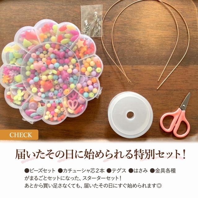 | 主な仕様 | 素材:アクリル ビーズカラー種類:カラフル・パール&カラフル・パステル・パール&パステル 【仕様】 ・ビーズセット ・カチューシャ芯2本 ・テグス ・はさみ ・金具各種 ※製造時期により、ビーズのデザインが多少異なる場合がございます。予めご了承ください。 |