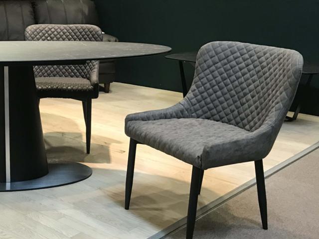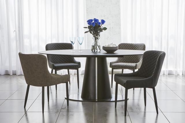 落ち着いた色合いのPVCレザーを使用した、上品な印象のダイニングチェアです。モダンデザインがシックなダイニング空間に溶け込み、贅沢で心地よい時間を過ごすことができます。