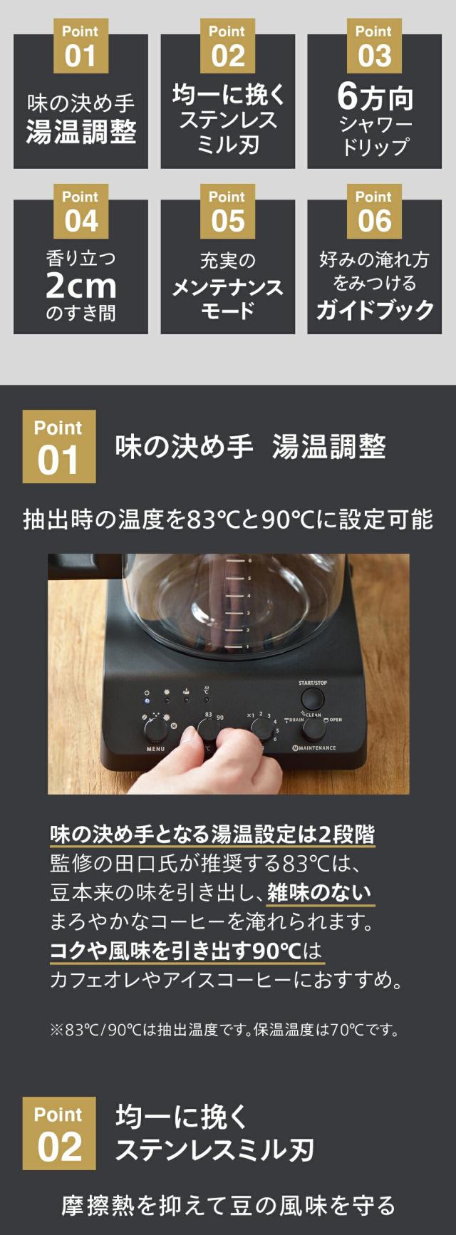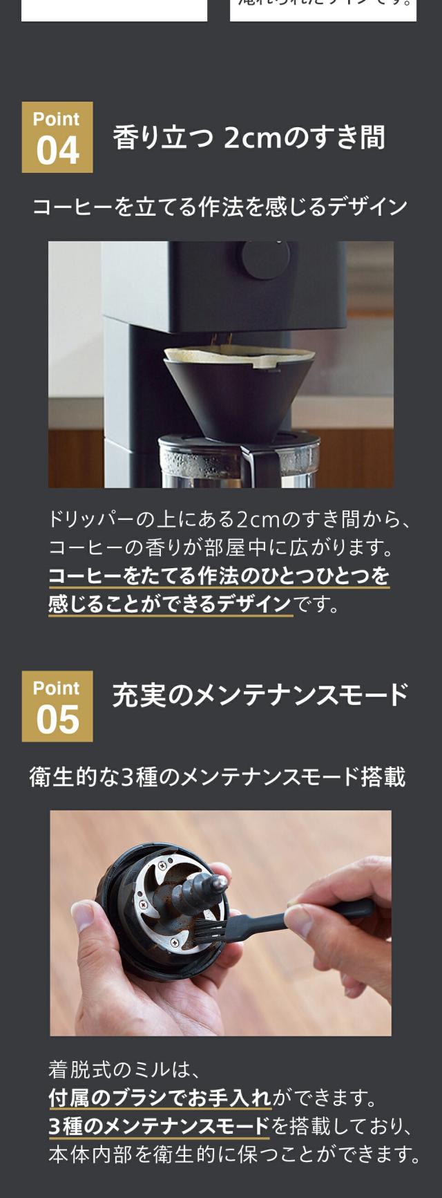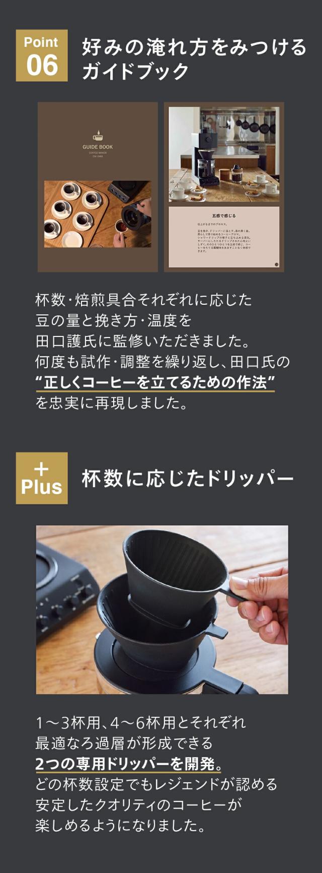 * 付属品:計量カップ、お手入れブラシ、ペーパーフィルター(サイズ「102」5枚)、ペーパーフィルター(サイズ「103」5枚)、取説、ガイドブック、かんたんガイド