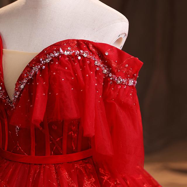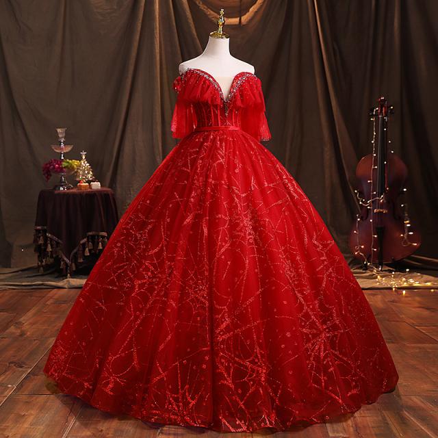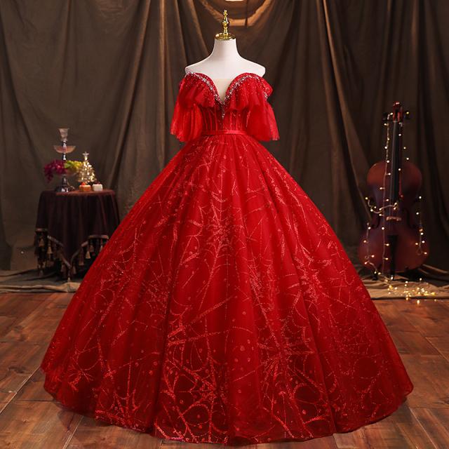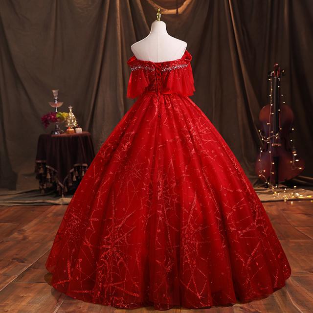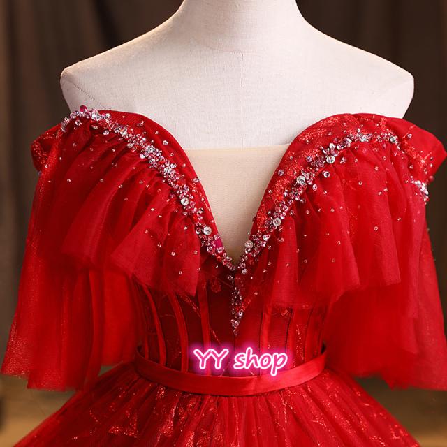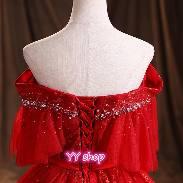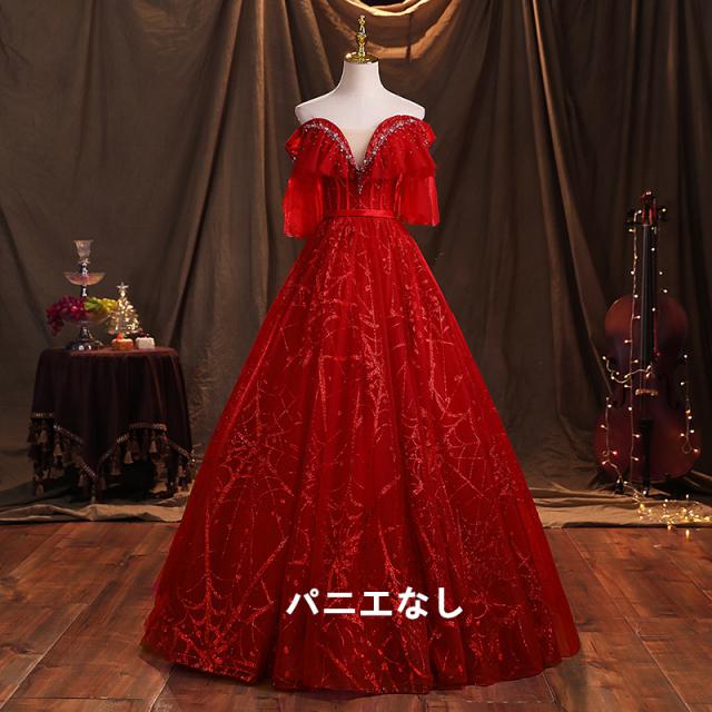高品質 カラードレス ロングドレス パーティドレス ワンピ Vネック オフショルダー 赤 二次会 発表会 パニエ付 オーダーサイズ可 D193