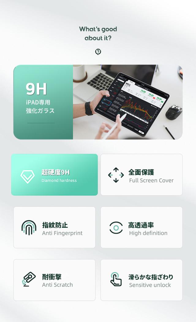 4つの特殊な素材と加工によって強度を生み出し、優れた機能性と画面操作の使い勝手を追及したガラスフィルムです。