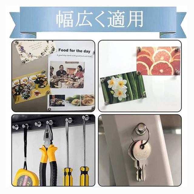 大事なメモや書類、領収書、写真やポスター、鍵や工具、キッチン用品など、いろいろな物を固定するのに使えます。