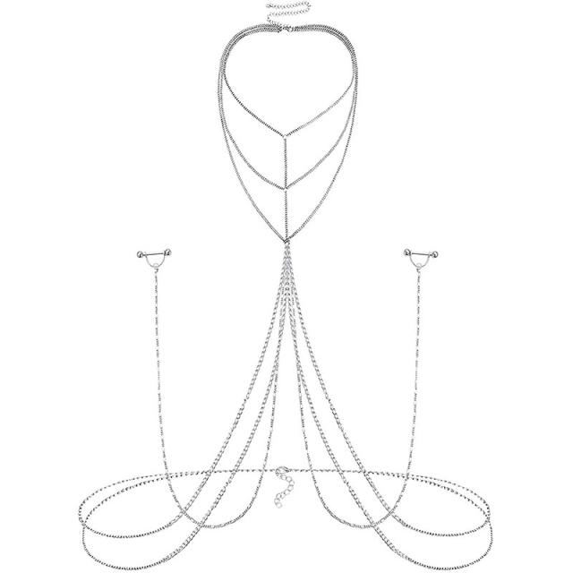 シルバーチェーンのネックレスとウエストチェーンと14ゲージのニップルピアスをクサリチェーンでつなげたお洒落なボディチェーン。