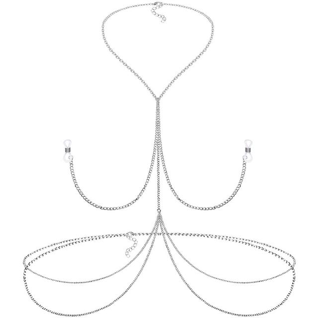 シルバーチェーンのネックレスとウエストチェーンとニップルチェーンをつなげたお洒落なボディチェーン。