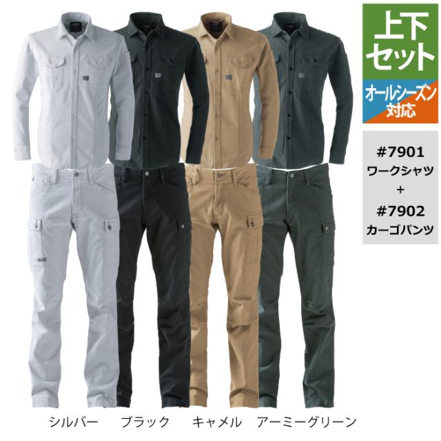 | 7901 ストレッチツイル3Dワークシャツ ●●オールシーズン用●素材:ストレッチバックツイル 綿98%・ポリウレタン2 %●スタイルにもこだわったペンポケット、スタイリッシュなビッグポケット、3Dカッティングによる抜群の動きやすさ●サイズ:S(胸囲/102、肩幅/41、着丈/71、袖丈/59、袖口囲/21)、M(胸囲/106、肩幅/43、着丈/73、袖丈/61、袖口囲/22)、L(胸囲/112、肩幅/45、着丈/75、袖丈/62、袖口囲/23)、LL(胸囲/118、肩幅/48、着丈/77、袖丈/63、袖口囲/24)、3L(胸囲/124、肩幅/50、着丈/79、袖丈/64、袖口囲/25)、4L(胸囲/130、肩幅/52、着丈/80、袖丈/64、袖口囲/26)、5L(胸囲/136、肩幅/54、着丈/81、袖丈/64、袖口囲/26)●カラー:シルバー、ブラック、キャメル、アーミーグリーン 7902 ストレッチカーゴパンツ ●●オールシーズン●素材:綿98% ポリウレタン2%●サイズ:S(ウエスト/78、股上/22.5、股下/80.5、ワタリ幅/30.5、裾幅/17.25)、M(ウエスト/82、股上/23.5、股下/80.5、ワタリ幅/32、裾幅/18)、L(ウエスト/86、股上/24.5、股下/80.5、ワタリ幅/34、裾幅/18.75)、LL(ウエスト/90、股上/25.5、股下/80.5、ワタリ幅/36、裾幅/19.75)、3L(ウエスト/94、股上/26.5、股下/80、ワタリ幅/38、裾幅/20.75)、4L(ウエスト/98、股上/27.5、股下/80、ワタリ幅/40、裾幅/21.5)、5L(ウエスト/103、股上/28.5、股下/80、ワタリ幅/43、裾幅/22.25)●カラー:シルバー、ブラック、キャメル、アーミーグリーン |