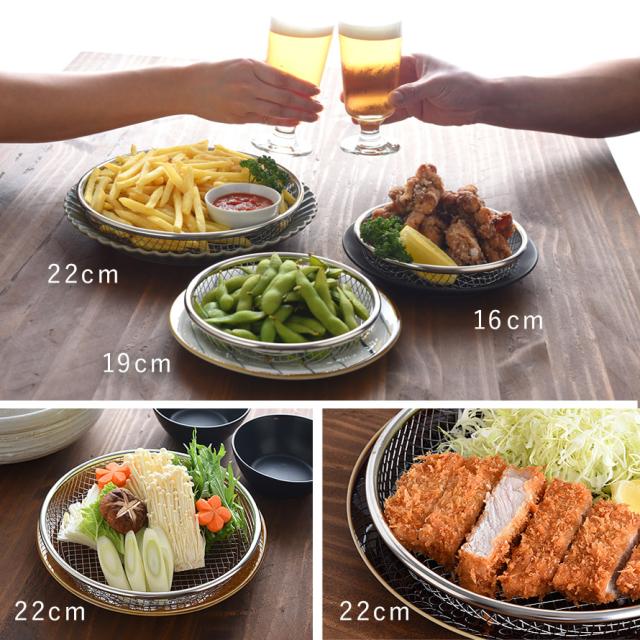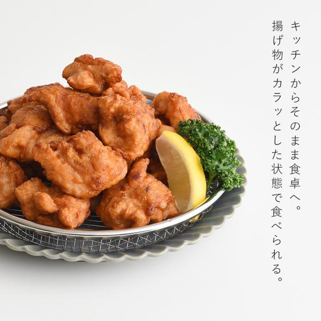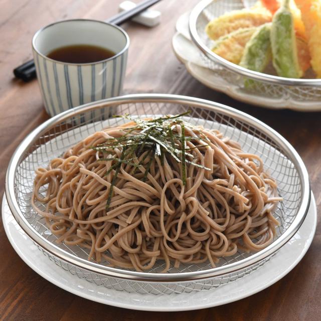 22cmサイズは、揚げ物の盛り付けはもちろん、お蕎麦や麺類の盛り付け、野菜や鍋具材の水切りなど、幅広い用途に対応。