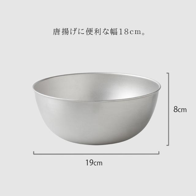 金属加工の産地、新潟県燕三条産の高品質ステンレスボウル18cm。唐揚げの下準備などにちょうどいいサイズ感です。