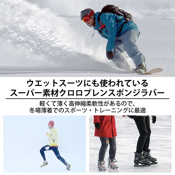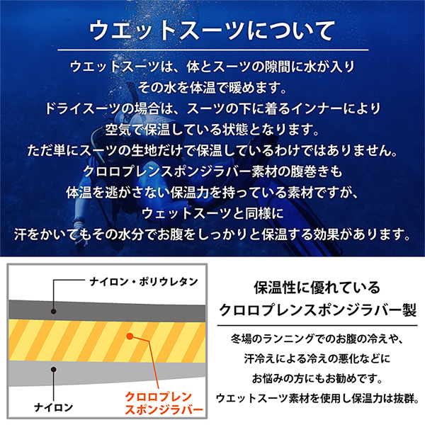 「ランニング用腹巻き」の素材は、ウエットスーツに使われているクロロプレンスポンジラバーを伸縮繊維生地でサンドイッチに挟み込み3層としてから、さらに特殊な加工を施すことで高伸縮を生み出しています。