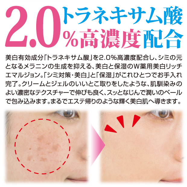 シミの元となるメラニンの生成を抑える、美白と保湿のW薬用美白リッチエマルジョン。