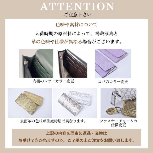 | その他詳細 | 天然皮革に関してはワシントン条約を元に適正に輸入された商品を販売しています。 撮影に使用された商品が届く場合がございますが、当店の運営に基づき、出荷時に問題の無いと判断し販売しております。 |