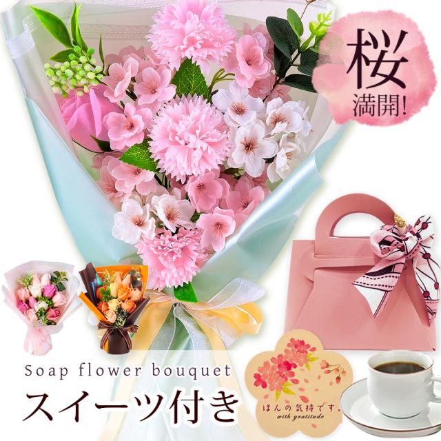 スイーツ付き スタンディング ソープフラワー Mサイズ 花束 / ギフト プレゼント 誕生日 母の日 発表会 入学 お祝い 花 花束 桜 さくら カーネーション ひまわり ヒマワリ バラ プリザーブドフラワー 退職 母親 女性 妻 20代 30代 40代 50代 60代