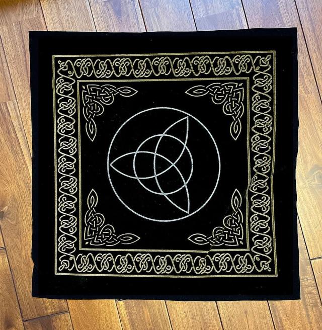 こちらのタロットクロスは、3という数を神聖視し、ローマ帝国の精神性にも影響を及ぼしたというアイルランド古代からの伝統的なトリニティ文様を中央にあしらったデザインです。
