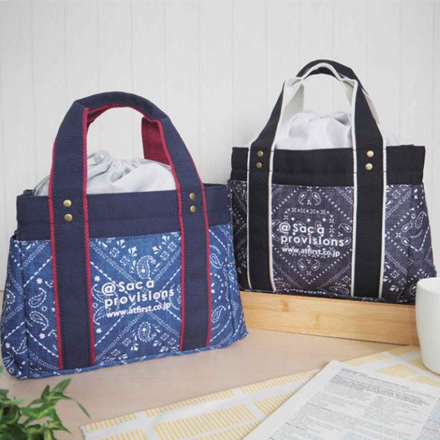 ●カジュアルなバンダナ柄のトート型ランチバッグです。