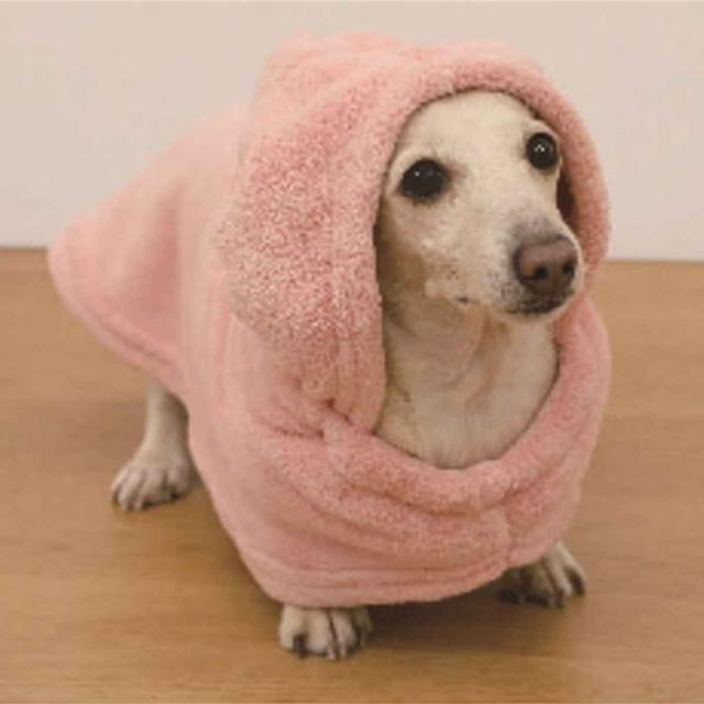 超小型犬から小型犬、猫に対したサイズです。シャンプー後や、雨の日のお散歩後に被せるだけ。水分を素早く吸収してくれるので、ドライヤー嫌いの子や、体力の低下したシニアペット、寒さが苦手な種類にもおすすめです。マイクロファイバーの隙間には空気が含まれており、保温性が高いので寒い日には、室内防寒ウェアとしても使用できます。