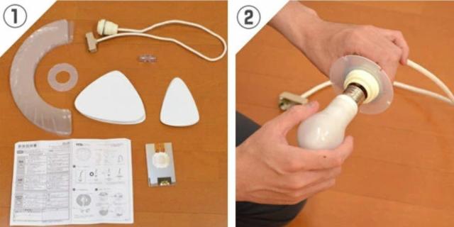 | 付属品の確認 組み立てる前に、必ず説明書に記載されている部品がすべて揃っているか確認してください。 | コードと電球をつける コードの先端部を回して取り外し、半透明の円のパーツをはさんでもう一度取り付け、さらに電球をはめます。 |