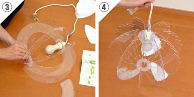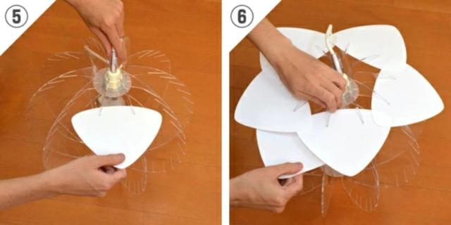 | 骨組みをつくる コード先端に取り付けた半透明の円の切れ込みに、透明半円のパーツをはめ込み、下部はもうひとつの半透明の円パーツにはめ込んでいきます。 | 骨組みが完成 内側の骨組みが完成です。骨組みの切り込みに差し込むように外側の飾りを付けていきます。 |