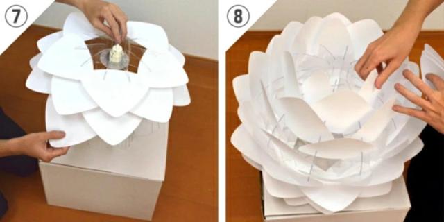 | 台に乗せて作業 中部くらいになってくると、切れ込みが見えにくくなってきて作業しづらいので、台や机などに乗せるとやりやすくなります。 | 逆さにすると組立てやすい 下部は、飾りの小さいほうを使います。商品をさかさまにするとスムーズに差込みやすくなります。 |