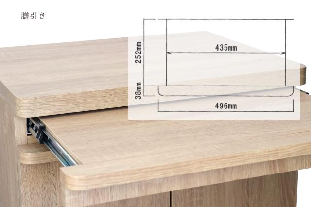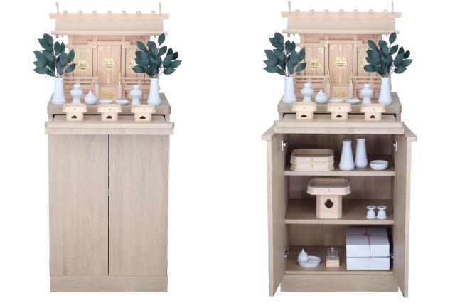 横幅50センチまで、小〜中型の三社宮や箱宮、祖霊舎などを美しくお祀りできます。スライド膳引き(引き出し)付き、お供えや神具一式などをたっぷり収納できる三段の棚は、すっきりと神棚を設置することができます。