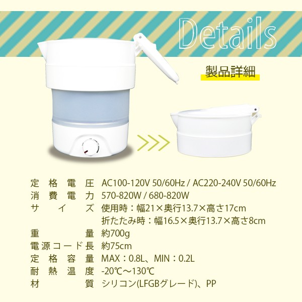 折りたたみ ケトル 0.8L ケトル 電気ポット 調理ケトル 一人暮らし 便利グッズ 海外 旅行 出張 トラベル コンパクト 小型 持ち運び 車中泊 折り畳み 軽量