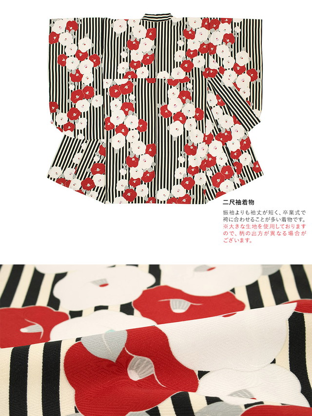 着物は、菊紗綾形の織り柄の生地に、ストライプに椿が咲くレトロモダンな柄ゆきです。