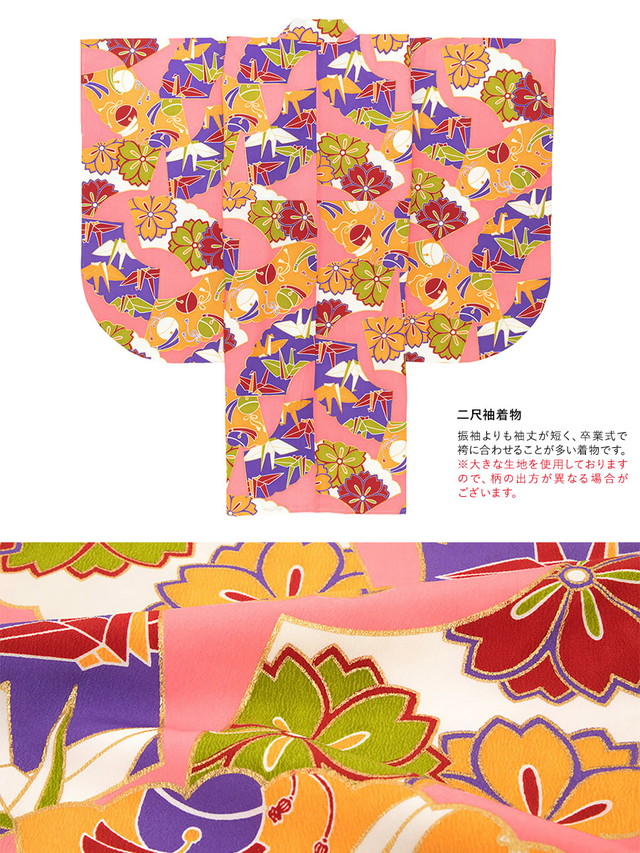 着物は、ピンクの地に桜や織り鶴、鈴がデザインされています。